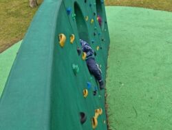 Für die Neuanlage des ParkSport Lurup wurde eine grüne Boulderwand mit Klettergriffen aufgebaut